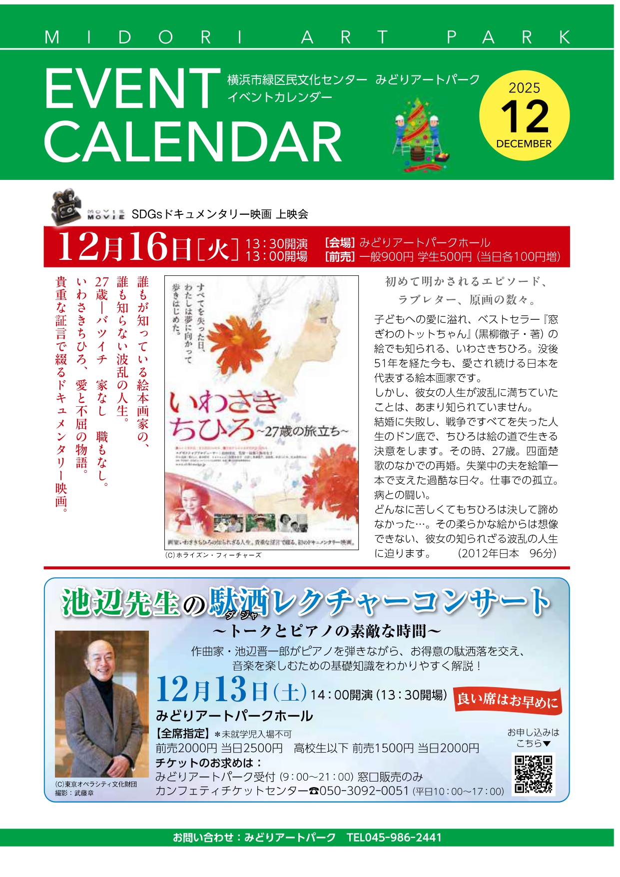 お知らせ イベントカレンダー12月号、アップしました! 2025.11.22 2025.11.23 お知らせ イベントカレンダー12月号 12月の充実イベントから、来るべき2026年の情報まで! 11月最終週より順次、当館や周辺の施設に配架されます。 過去のイベントカレンダーはこちらから。。。 Post クリスマス*スペシャル ロビーピアノ ミニコンサート開催決定! 前の記事 【12/6(土)14:00~受付(電話のみ)】1月分 みどりアートパークでヤマハCFXを弾こう! 次の記事 information 【12/6(土)14:00~受付(電話のみ)】1月分 みどりアートパークでヤマハCFXを弾こう! 2025.11.23 クリスマス*スペシャル ロビーピアノ ミニコンサート開催決定! 2025.11.21 <施設点検日のお知らせ> 2025.11.19