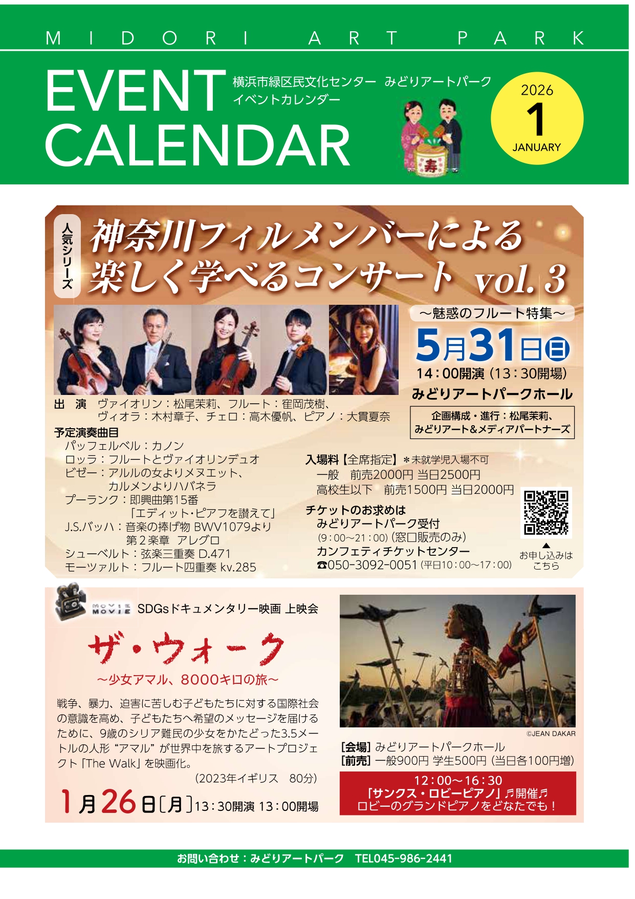 お知らせ イベントカレンダー2026年1月号、アップしました! 2025.12.20 お知らせ イベントカレンダー2026年1月号 2026年のイベント情報が満載!早耳情報もご注目ください。。。 12月クリスマス・イブより順次、当館や周辺の施設に配架されます。 *過去のイベントカレンダーはこちらから* Post 【1/12(月祝)14:00~受付(電話のみ)】2月分 みどりアートパークでヤマハCFXを弾こう! 前の記事 information 【1/12(月祝)14:00~受付(電話のみ)】2月分 みどりアートパークでヤマハCFXを弾こう! 2025.12.19 <施設点検日のお知らせ> 2025.12.16 【キャンセル出ました!】12月分 みどりアートパークでヤマハCFXを弾こう! 2025.12.03