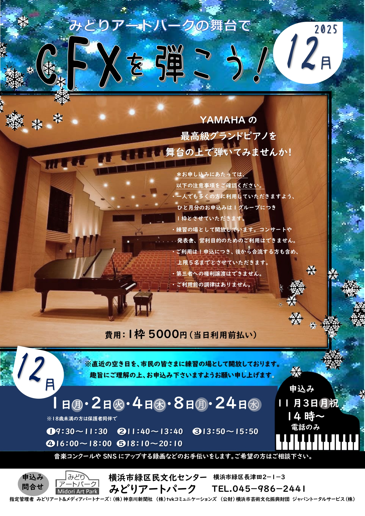 【11/3(月・祝)14:00~申込受付】12月分 みどりアートパークでヤマハCFXを弾こう!