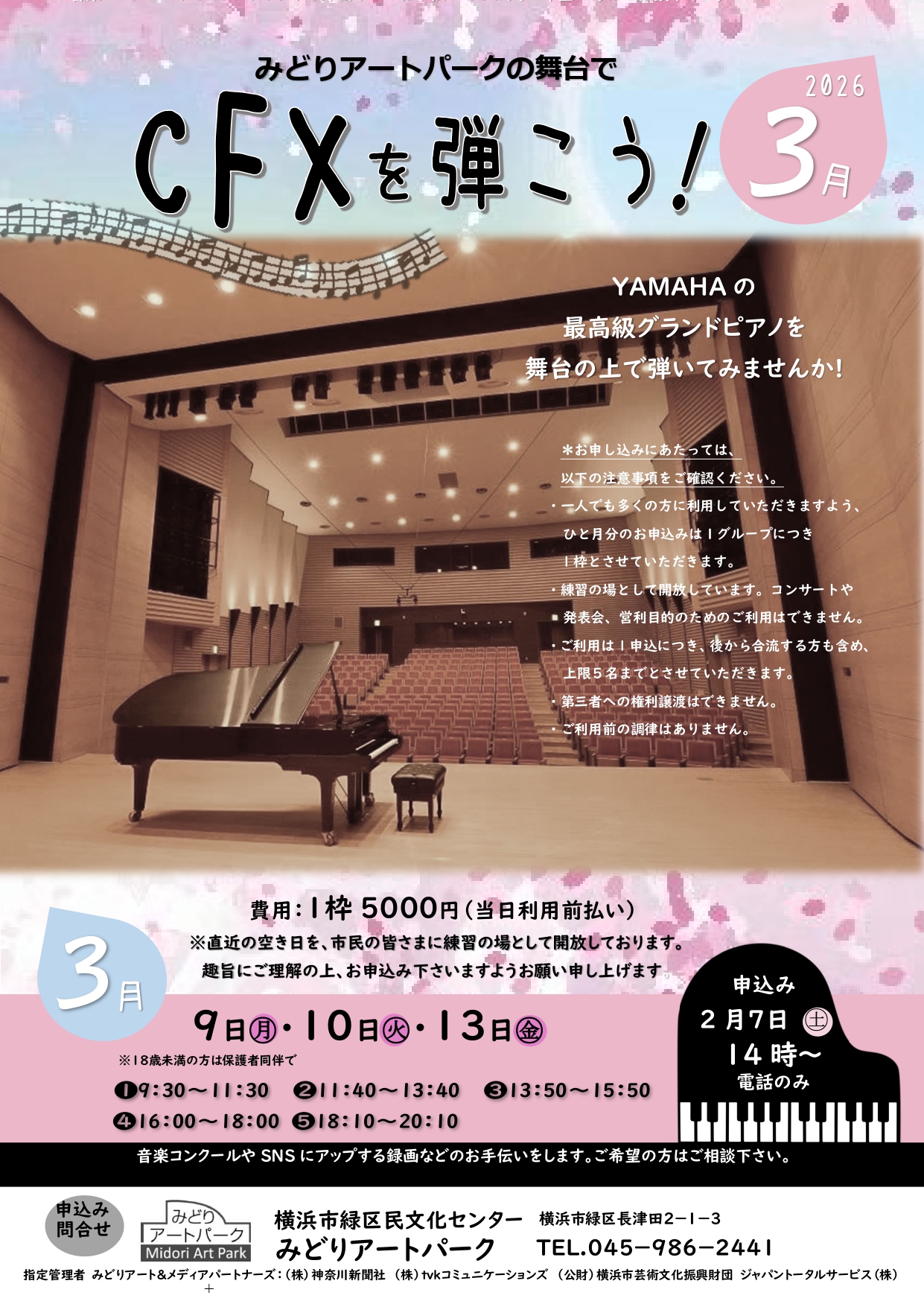 イベント , お知らせ 【2月7日(土)14:00~受付(電話のみ)】3月分 みどりアートパークでヤマハCFXを弾こう! 2026.01.24 イベント , お知らせ 2026年3月分 みどりアートパークでヤマハCFXを弾こう! 詳しくは、こちら Post イベントカレンダー2026年2月号、アップしました! 前の記事 外壁等修繕工事のお知らせ 次の記事 information 外壁等修繕工事のお知らせ 2026.01.30 イベントカレンダー2026年2月号、アップしました! 2026.01.22 <施設点検日のお知らせ> 2026.01.20