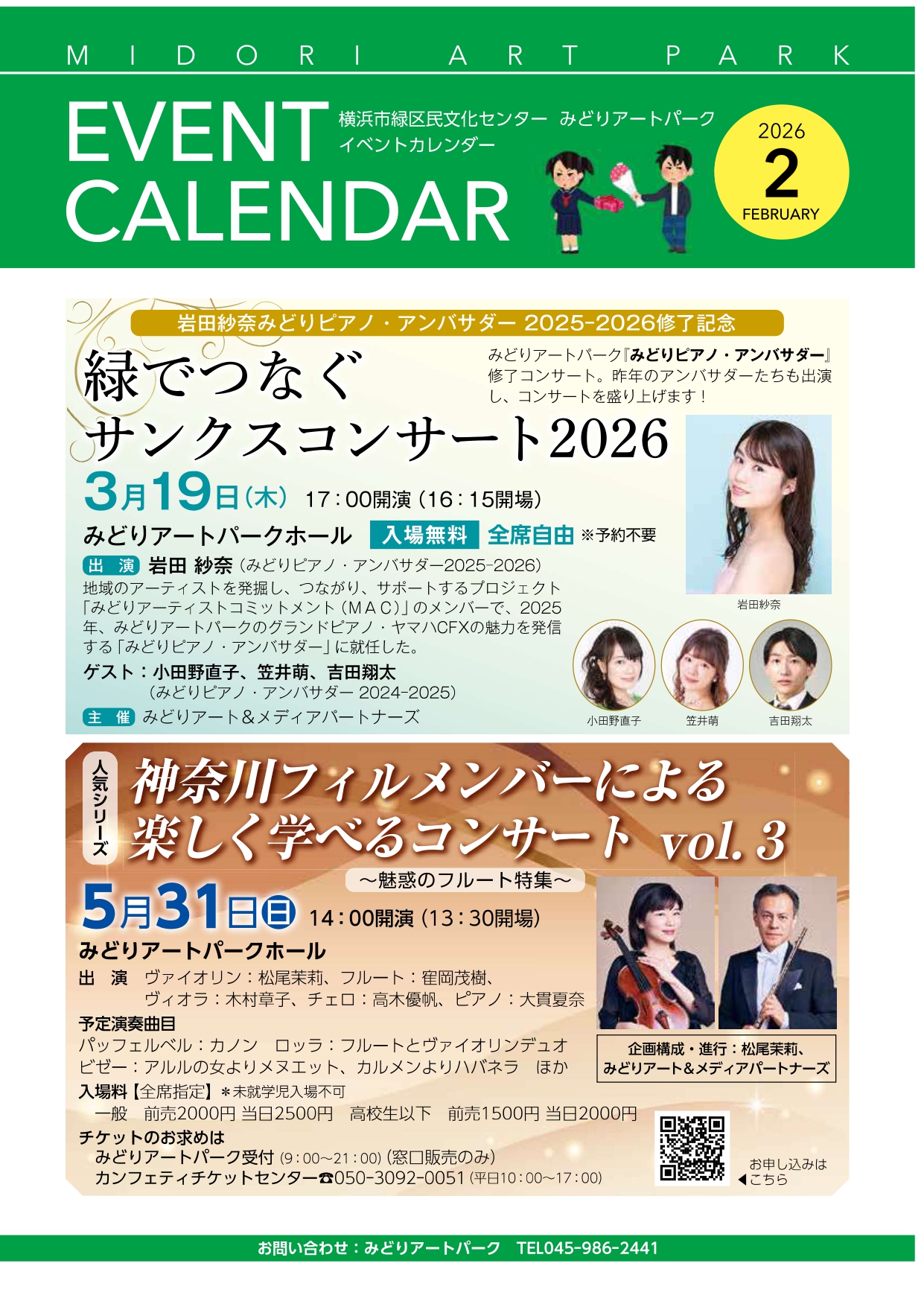 お知らせ イベントカレンダー2026年2月号、アップしました! 2026.01.22 お知らせ イベントカレンダー2026年2月号 2026年春のイベント情報が満載!早耳情報もご注目ください。。。 1月下旬より順次、当館や周辺の施設に配架されます。 *過去のイベントカレンダーはこちらから* Post <施設点検日のお知らせ> 前の記事 【2月7日(土)14:00~受付(電話のみ)】3月分 みどりアートパークでヤマハCFXを弾こう! 次の記事 information 外壁等修繕工事のお知らせ 2026.01.30 【2月7日(土)14:00~受付(電話のみ)】3月分 みどりアートパークでヤマハCFXを弾こう! 2026.01.24 <施設点検日のお知らせ> 2026.01.20