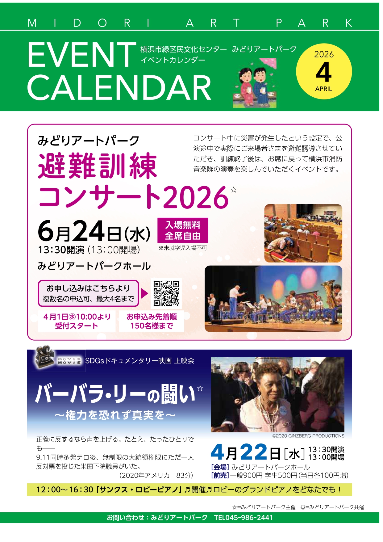 お知らせ イベントカレンダー26年4月号、アップしました! 2026.03.25 お知らせ イベントカレンダー26年4月号 2026年の新年度イベント情報が満載! 3月下旬より順次、当館や周辺の施設に配架されます。 *過去のイベント情報はこちらから* Post 【4/4(土)14:00~受付開始】5月分 みどりアートパークでヤマハCFXを弾こう! 前の記事 information 【4/4(土)14:00~受付開始】5月分 みどりアートパークでヤマハCFXを弾こう! 2026.03.24 【6/1~受付開始!】第8期インクルーシブダンスワークショップ「のはらハみどり」 2026.03.23 <施設点検日のお知らせ> 2026.03.18