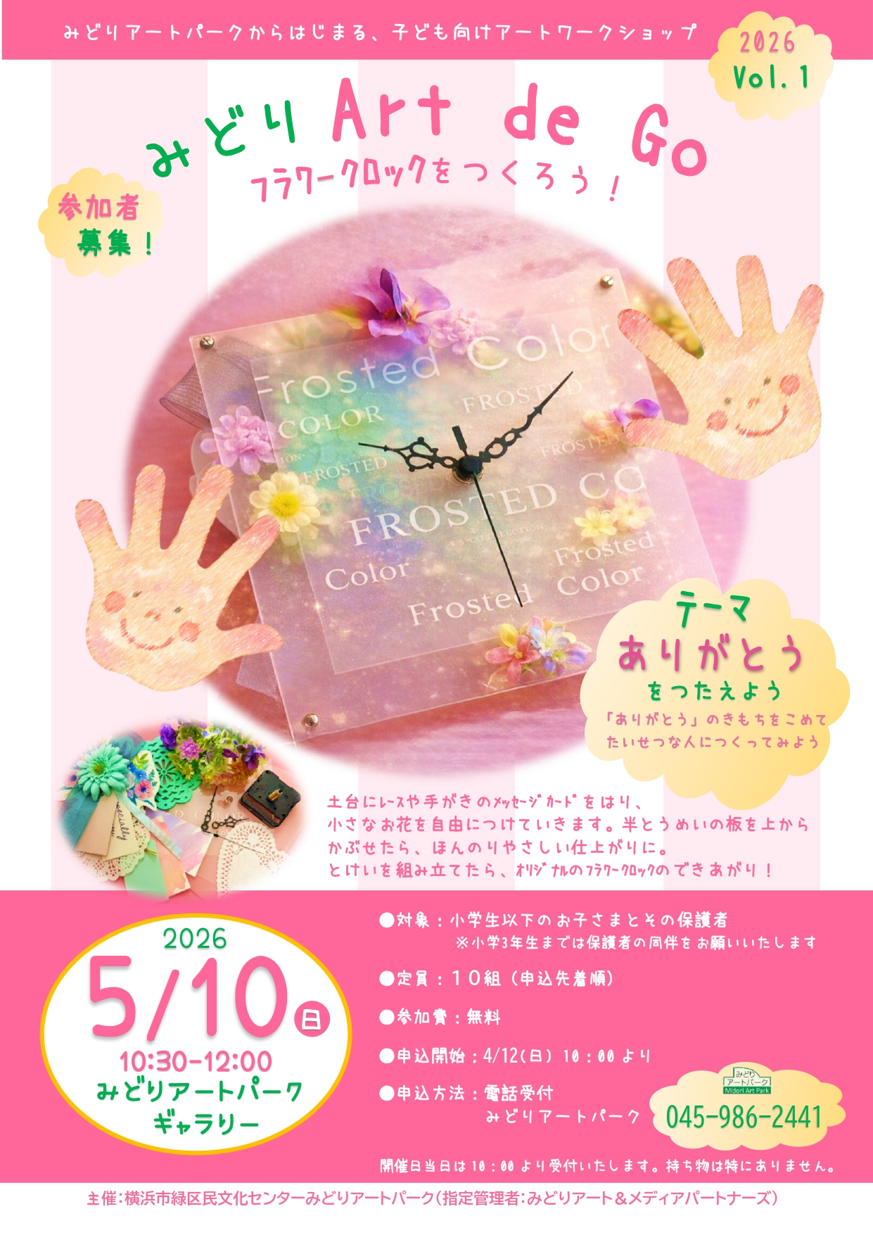 【4/12(日)10時~受付開始】みどり Art de Go~フラワークロックをつくろう!~参加者募集! 2026.04.11 みどりアートパークからはじまる、子ども向けアートワークショップ 詳しくはこちら Post イベントカレンダー26年4月号、アップしました! 前の記事 information イベントカレンダー26年4月号、アップしました! 2026.03.25 【空き1枠あります!】5月分 みどりアートパークでヤマハCFXを弾こう! 2026.03.24 【6/1~受付開始!】第8期インクルーシブダンスワークショップ「のはらハみどり」 2026.03.23