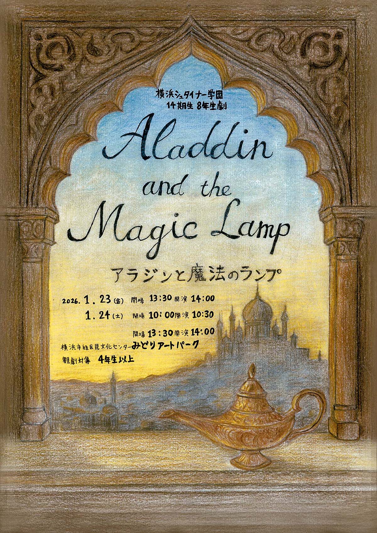 8年間の集大成となる本公演は、アラビアンナイトより「アラジンと魔法のランプ」を8年生8人が、ゼロから創り上げるクラス劇です。役者、大道具や小道具、衣装づくり。舞台転換、チラシづくり、そして劇中の演奏、時に作曲まで、すべてを自分たちで手がけます。どうぞ温かい目で観つつ、ご期待ください!
