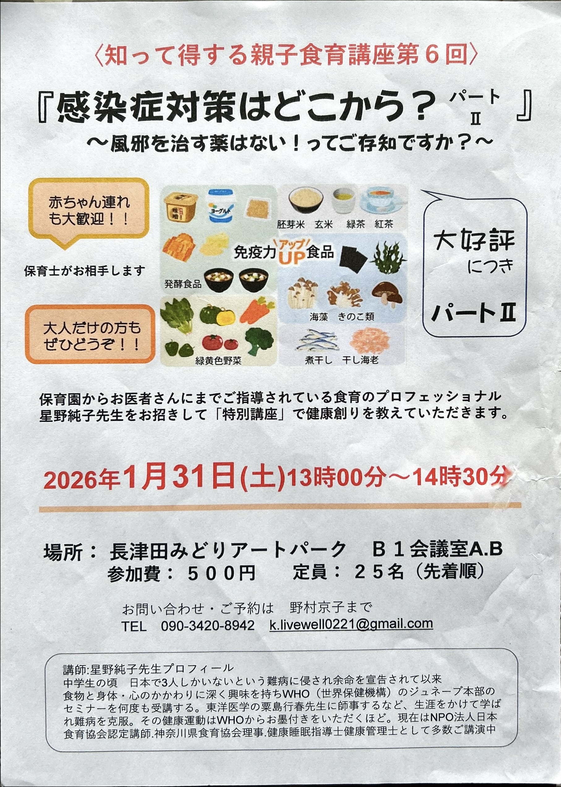 11月15日に開催した第5回が好評でしたので、第6回も『感染症対策はどこから?』パートⅡで、感染症が一番流行するこの時期に、講師の星野純子先生に詳しくお話していただきます。お子様とご一緒のご参加大歓迎です。お子様もどんなに小さくても、ちゃんと肌からお話を吸収するそうです。ご参加お待ちしています。