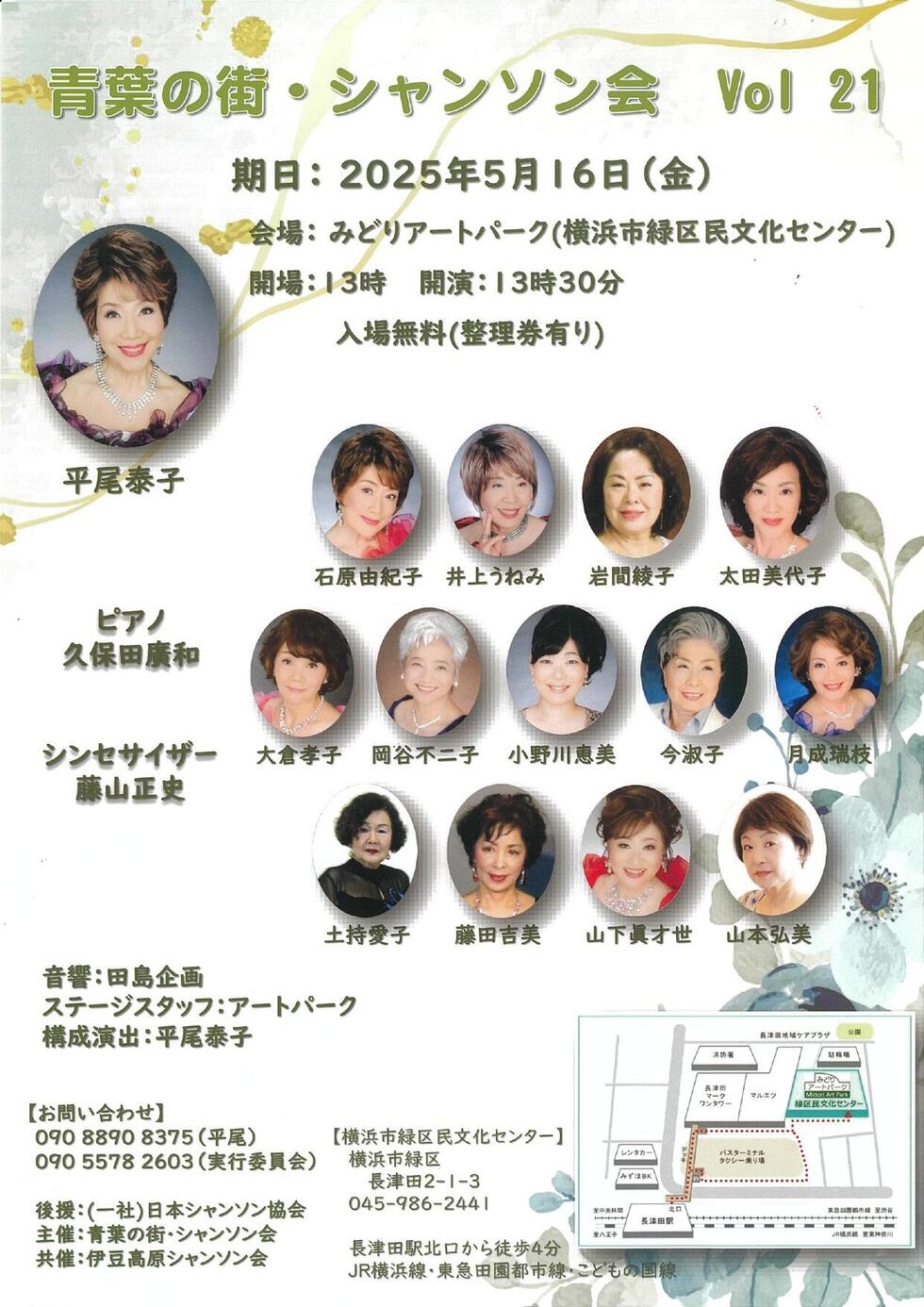 | 主催・問合せ | 青葉の街シャンソン会 実行委員会 TEL.090-5578-2603 FAX.045-978-3977 |