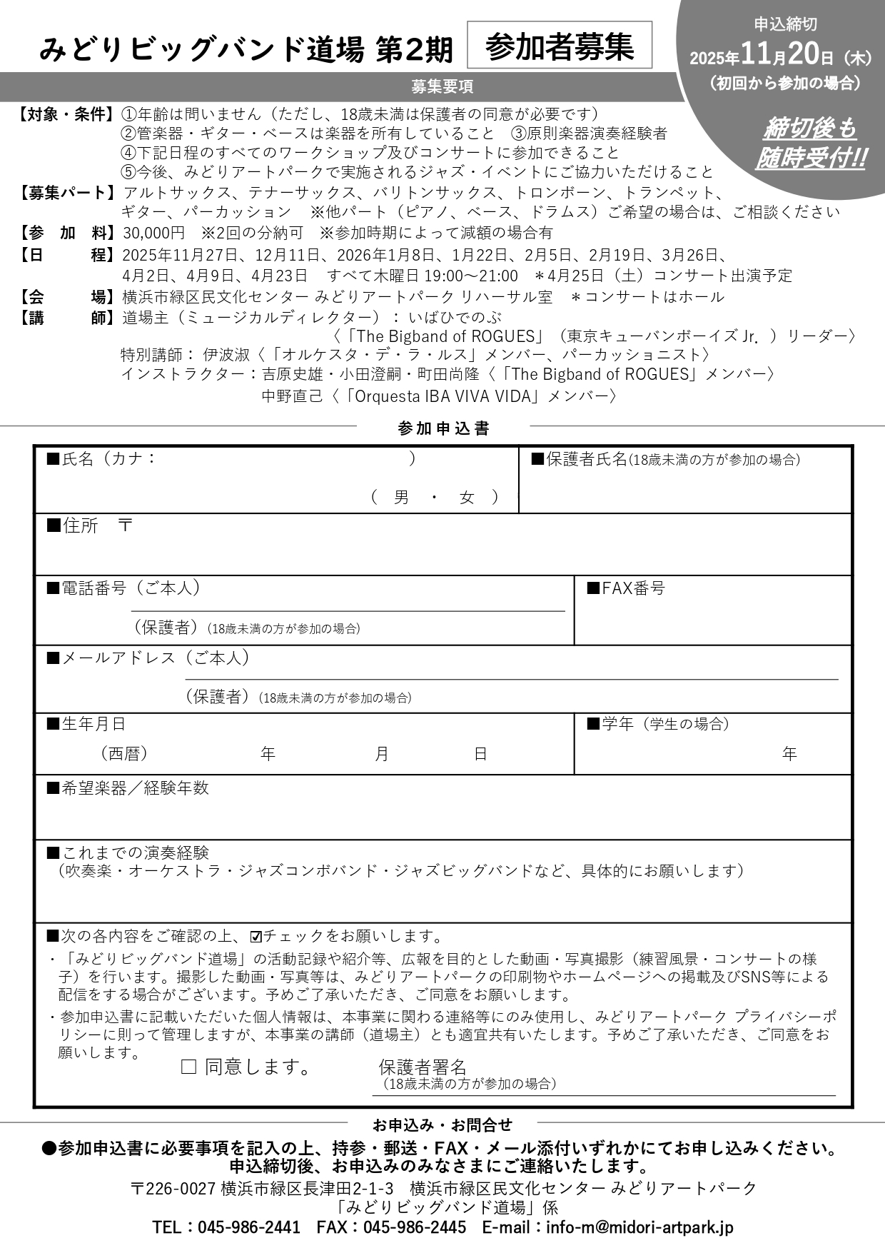 〒226-0027 横浜市緑区長津田2-1-3 横浜市緑区民文化センターみどりアートパーク「みどりビッグバンド道場」係